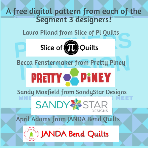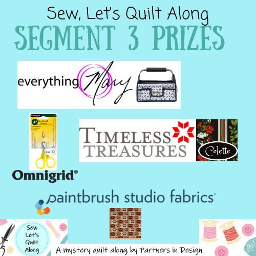 • September 9th at 11:59 pm EDT – Last day to enter for the Segment 3 giveaway. Post a picture with all 4 blocks in this segment on either the linky party (find it on any of the blogs), Partners in Design Facebook page, or Instagram with the hashtag #SewLetsQAL.