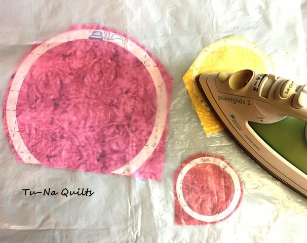 I did not check to make sure I had enough fabric for the ring until after I had already fused the fusible web onto the circle. Of course, this was all of this particular fabric that I had left. I looked at the pattern and saw that only part of the ring showed so I decided to take a chance that this was enough to make it work. The fusible web for the rings are fused to the RIGHT side of the fabric. This is not the usual side to fuse it on so make special note of this. This is one of Laura’s brilliant ideas to give your buttons a unique look.