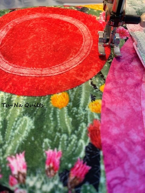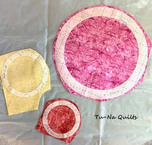 After the fray check was dry, I proceeded to applique the circles and rings. But I noticed the edges of the red one was still getting whiskers. Then I remembered that I had not changed the machine needle since I worked on my last project. So I was trying to applique with a denim needle. Once I changed it to a new needle, all was fine. But then I only had the larger pink circle and ring left to finish.