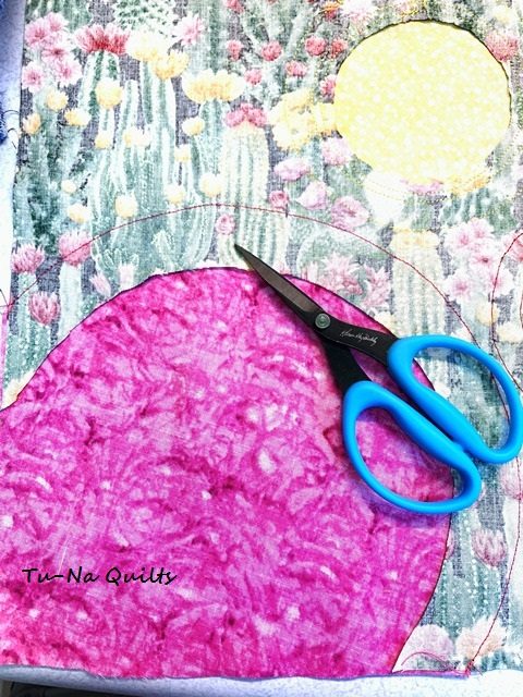 Usually I try to trim a half inch from the stitching line but the circle is fused down this much. I usually hold my breath while I cut it away as I’m afraid of cutting into the top fabric. So I’ve learned to put my finger between the top fabric and my scissors and to gently pull the fabrics apart. I keep this medium Karen Buckley scissors only for applique.