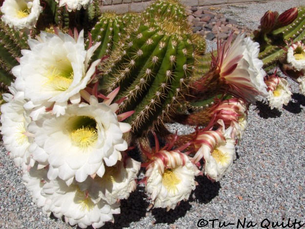 A Saguaro starts to produce blossoms once it reaches 35 years of age. Each blossom, which opens at night and begins to wither around midday, lasts for only one day. Usually they bloom in late May or early June around here. Last spring they bloomed early and we were able to see the desert ablaze with color before we left for home up north. This one is particularly full of blossoms. The Saguaro blossom is Arizona’s state flower.